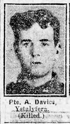 Ystalyfera FallenWar Graves & Remembrance GravesAlcwyn DaviesThis is the memorial page for Alcwyn Davies, native of Ystalyfera, killed during the First World War. The information on Alcwyn Davies comes principally from the Commonwealth War Graves Commission, from the Labour Voice newspaper, and the Parish Burial Register (courtesy of the Swansea Archives). Please note the discrepancy in date of death, 13th versus 18th, is probably down to a transcription error, but whether the newspaper at the time, or the CWGC made the error, is unknown.