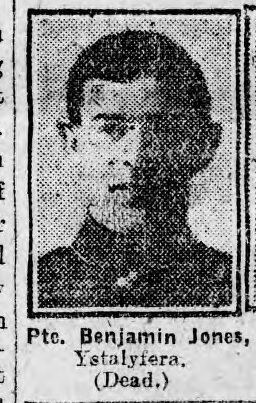He leaves a widow and two young children to mourn their loss, now resident at Senghenydd, where deceased worked prior to his enlistment. He left Ystalyfera a number of years ago, but had a large number of friends in the district. He was buried with military honours.