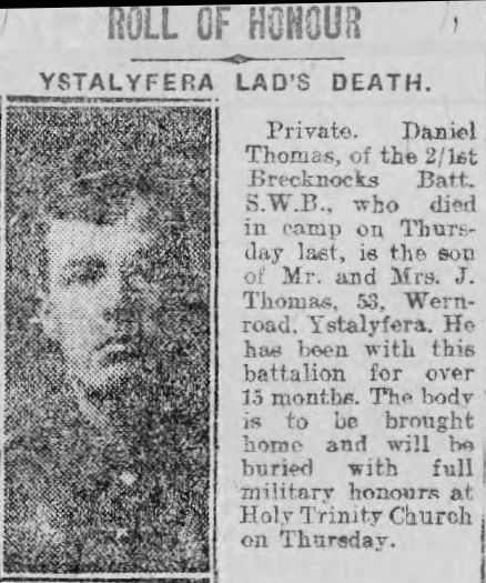 On Sunday last, Mr and Mrs John Thomas near Wern Fawr, received the sad news that their son Private Daniel Thomas of the 3/1st Brecknocks, stationed at Bedford had died suddenly in hospital. It transpired later that the deceased had taken part in a route march of about 15 miles on the preceding day and it can only be surmised that the fatigue of this march found an unexpected weak spot in his constitution.