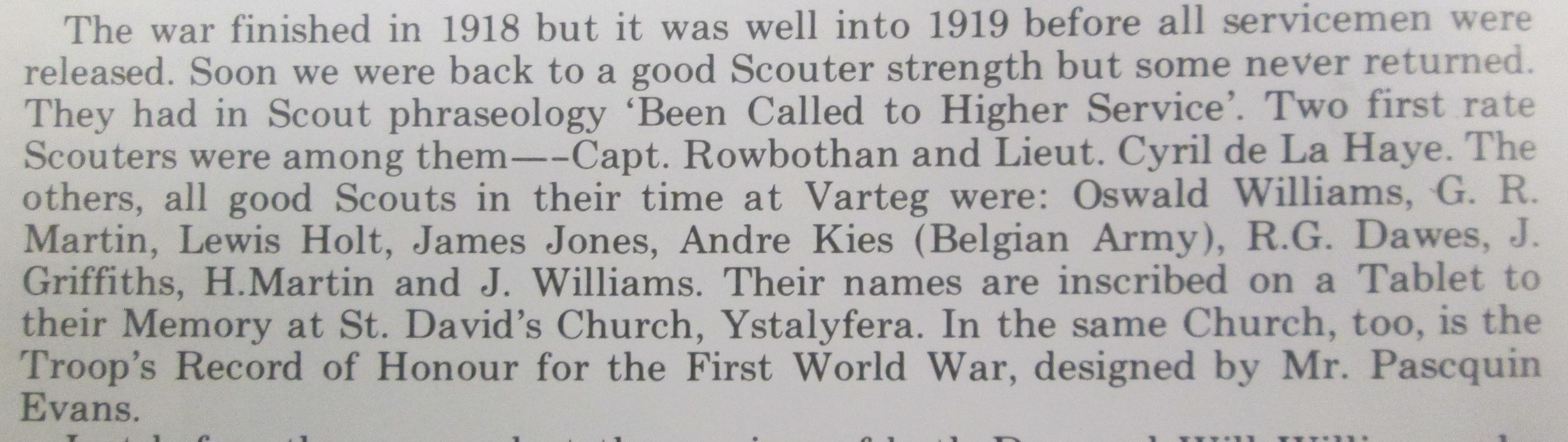 Captain Rowbothan came to Ystalyfera from Cardiff in 1912. He was a mining engineer working with the management at Tarenni Colliery. A Territorial, he was called up with others in the T. A., on the first day of the war in 1914. He was serving with the 6th Welsh Regiment when he was killed in Gallipoli.