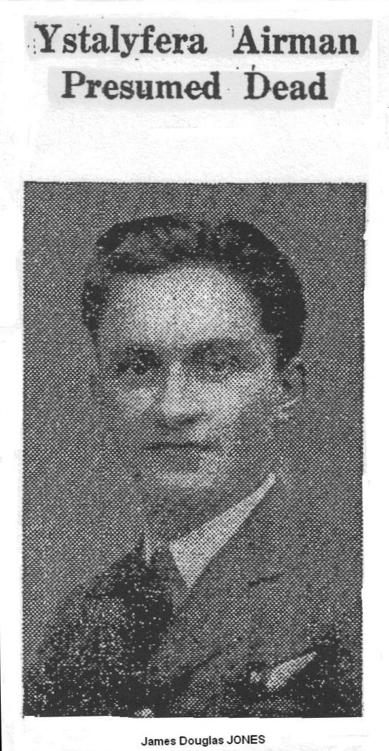 Deep sympathy will be felt with Mr and Mrs Tom Jones, Telephone Exchange, Wern Road, Ystalyfera, who, on Thursday received official notification that their son, Flying Officer Douglas Jones, RAF, was reported missing from operations over enemy territory. He was 22 years of age and was educated at the Ystalyfera County School. After joining the RAF he proceeded to Canada where he received his training and was awarded his wings 12 months ago.