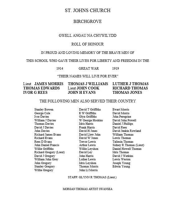 News reached Llansamlet on Wednesday of the death in action of Private Luther Thomas, Birchgrove. Private Thomas, who joined the Yeomanry, was transferred to the Welsh, and had been in France for some time. Educated at Ystalyfera County School and Bangor University, he was until enlistment on the staff of Glais School. He leaves a young widow.