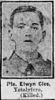 Ystalyfera FallenWar Graves & Remembrance GravesWilliam CleeThis is the memorial page for William Clee, native of Ystalyfera, killed during the First World War. He would appear to have been generally known by his middle name, Elwyn, as evidence by newspaper reports about him. The information on William Clee comes principally from the Commonwealth War Graves Commission, from the Labour Voice newspaper, and the Parish Burial Register (courtesy of the Swansea Archives).