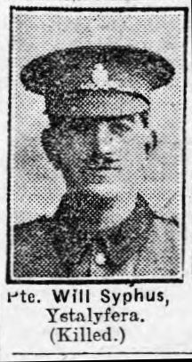 William Syphas is not on the Ystalyfera War Memorial. This is probably due to his having been resident in lodgings in Ystalyfera pre-war, rather than permanently living there.