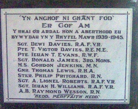 Pantteg Chapel contains a memorial tablet to the members of the congregation who were killed in the First World War.
