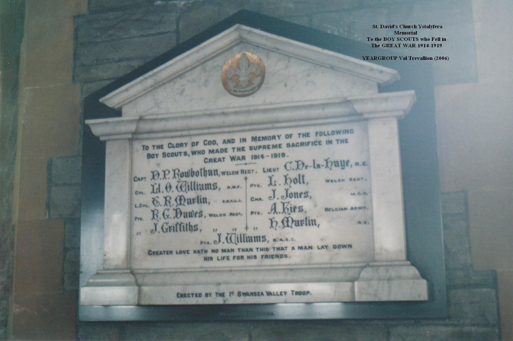 A marble tablet commemorating the eleven former Scouts of Ystalyfera who died in the Great War was unveiled at a special commemorative service at Saint David's Church in May 1920.